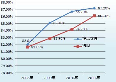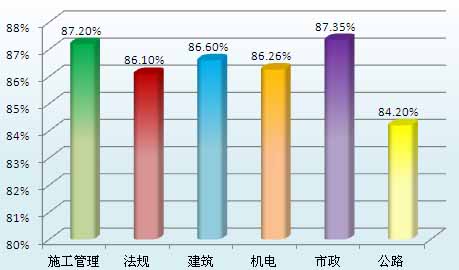 網(wǎng)校2011年二級(jí)建造師考試輔導(dǎo)各科通過率分別為:建設(shè)工程施工管理87.20%,建設(shè)工程法規(guī)及相關(guān)知識(shí)86.10%,建筑工程86.60%,機(jī)電工程86.26%,公路工程84.20%,市政工程87.35%。(如下圖所示)