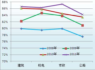 2011年專業(yè)課通過率對(duì)比2010年分別增長(zhǎng)了建筑工程0.5%,機(jī)電工程0.46%,市政工程2.85%,公路工程0.80%。(如下折線圖所示):