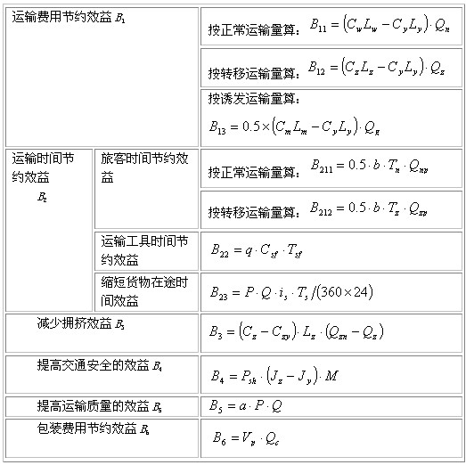 ■效益:表現為所設計的運輸系統在客貨運輸過程中發生的各種運輸費用的節約、運輸時間的節約、擁擠程度的緩解、運輸質量的提高、包裝費用的節約、設施設備維修養護費用的減少等等。