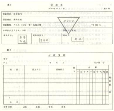 3.2010年11月2日,采購員張旭出差預借差旅費1900元,出納以現金付訖。原始憑證見表1。根據原始憑證編制記賬憑證。記賬憑證格式見表2,記賬憑證編號為付字第6號。(6分)