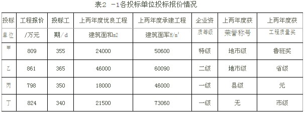 某住宅工程,標底價為850萬元,標底工期為360d,評定各項指標的相對權重:工程報價40%,工期10%,質量35%,企業信譽15%.現在相對以下甲、乙、丙、丁四個投標單位的技標報價情況(表2 -1)進行綜合評價,確定其中標單位。