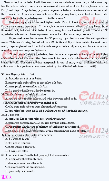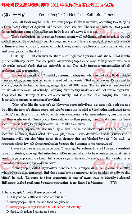 閱讀理解:第二篇 Some People Do Not Taste Salt Like Others