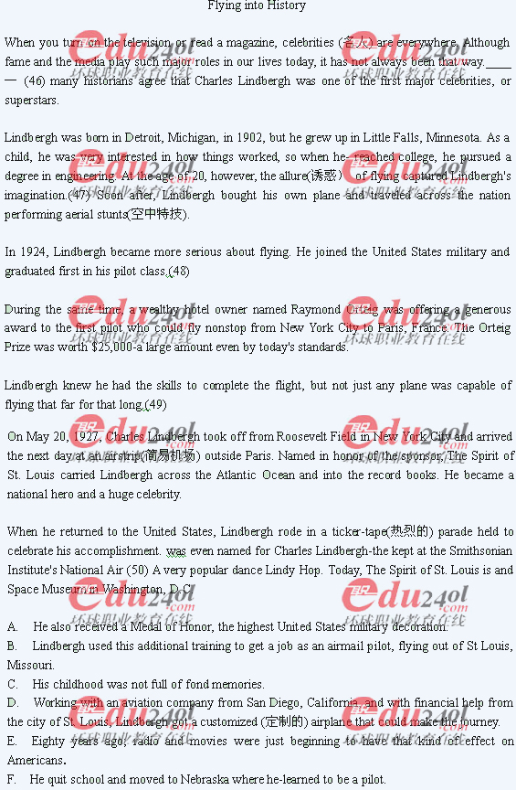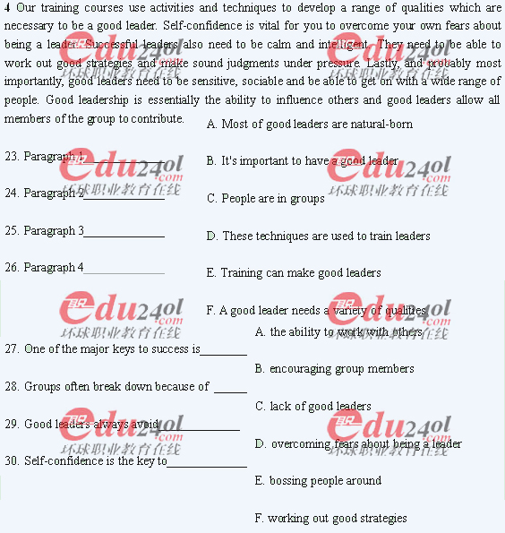 下面的短文后有2項測試任務:(1)第23~26題要求從所給的6個選項中為第1~4段每段選擇1個最佳標題;(2)第27~30題要求從所給的6個選項中為每個句子確定1個最佳選項。