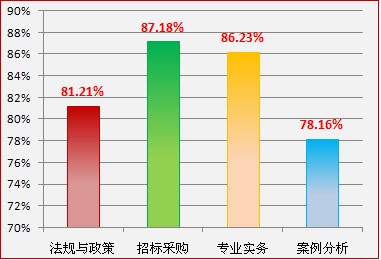環球網校(www.edu24ol.com)通過對網校學員的回訪及學員的成績反饋進行統計,得出網校2010年招標師考試輔導各科通過率分別為:招標采購法律法規與政策通過率為81.21%、項目管理與招標采購通過率為87.18%、招標采購專業實務通過率為86.23%、招標采購案例分析通過率為78.16%;2010年全科輔導通過率為58.37%。