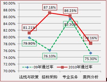 圖中很明顯的看出2010年網校通過率遠超了2009年輔導通過率,從電話回訪和學員反饋中得出:2010年招標采購這科考試較之2009年相對簡單,而其他三科都偏難,尤其是法規,相對其他科目來說是最難的。