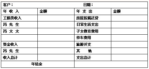 馮先生家庭財務支出比較穩定 ,除了基本的伙食、交通通訊費用外,就是不定期的服裝購置和旅游支出,兒子出生后每月需各種營養、衣物用品費用1500元,二人有一輛市值20萬元的中檔汽車,每月各種養車費用約1500元。馮太太辦的美容卡每年需要12000元,夫婦平均每月的日常生活開支為3000元,馮先生應酬較多,家庭應酬支出平均每月2000元,每年旅游支出1萬元。