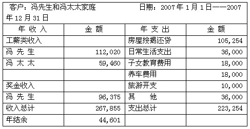 馮先生家庭屬于高收入、高支出的家庭,雖然收入較多,但由于債務支出與各種家庭支出較多,年結余狀況并不良好。此外馮先生流動性比率過高、家庭成員和財產的風險管理保障不充分、收入有限,如果想順利的實現馮先生的理財規劃目標,還需要仔細規劃。