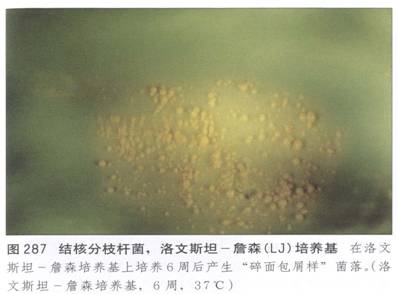 生長(zhǎng)緩慢,最快的分裂速度為18小時(shí)一代。在固體培養(yǎng)基上,2~6W才出現(xiàn)肉眼可見的菌落。典型菌落為粗糙型,表面干糙呈顆粒狀,不透明,乳白色或淡黃色,表面呈皺紋狀,如菜花樣。
