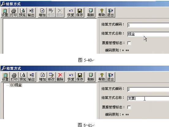 結(jié)算方式設(shè)置主要包括:結(jié)算方式編碼、結(jié)算方式名稱、票據(jù)管理標(biāo)志等。票據(jù)管理標(biāo)志是軟件為輔助出納對銀行結(jié)算票據(jù)而設(shè)置的功能,類似與手工系統(tǒng)中的支票登記簿的管理方式。