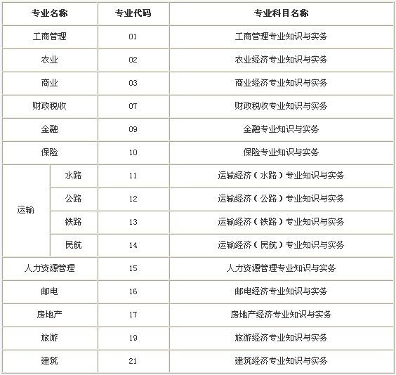 《專業知識和實務》科目均分為工商管理、農業、商業、財政稅收、金融、保險、運輸(水路、公路、鐵路、民航)、人力資源管理、郵電、房地產、旅游、建筑12個專業,其中運輸分為水路、公路、鐵路、民航4個子專業。