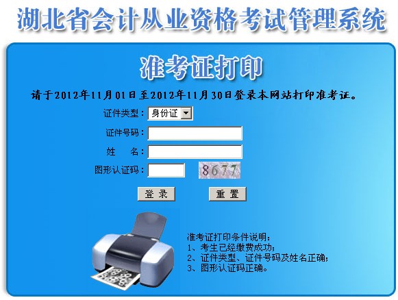 湖北省2012下半年年會計從資格考試準考證打印考試前10日,考生登錄湖北省財政廳公眾網,在報名系統中憑本人的姓名、身份證號和系統驗證碼進入考生信息管理模塊,自行打印準考證,準考證須采用激光打印機打印,相片、姓名、準考證號、身份證號等要素應清晰無誤。