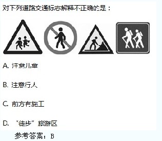 本題解析:。本題考查科技常識(shí)。B選項(xiàng)是禁止行人通行。因此,本題選擇B選項(xiàng)。