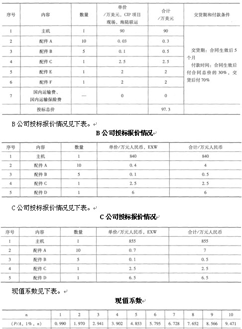 招標文件同時規(guī)定,評標采用最低評標價法;帶星號參數(shù)不符合要求的廢標,不帶星號參數(shù)每項負偏離增加投標總價的0.5%,最多可偏離10項;交貨期提前不降低評標價;交貨期每延期1周,評標價格增加0.5萬美元,不足1周的按1周計;交貨期最多允許延期5周;付款條件如與招標文件要求不一致,應(yīng)分別按照招標文件和投標文件的付款條件將投標報價折算為合同生效時的現(xiàn)值,將兩者的差額計入評標價,折現(xiàn)率為月利率1%,按復(fù)利計算;進口關(guān)稅稅率10%;進口增值稅率17%。開標當日匯率:1美元=6.5元人民幣。