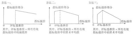 在編制招標方案和招標文件的過程中,招標人擬采用不同的計算方法計算上述三個標包中投標人投標報價得分,用示意圖表示,如下圖所示。