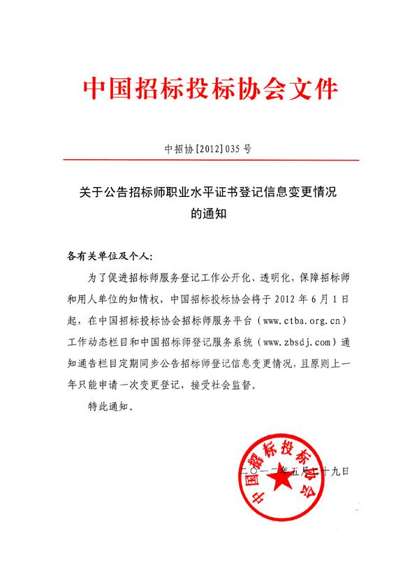 關于公告招標師職業水平證書登記信息變更情況的通知