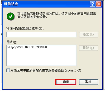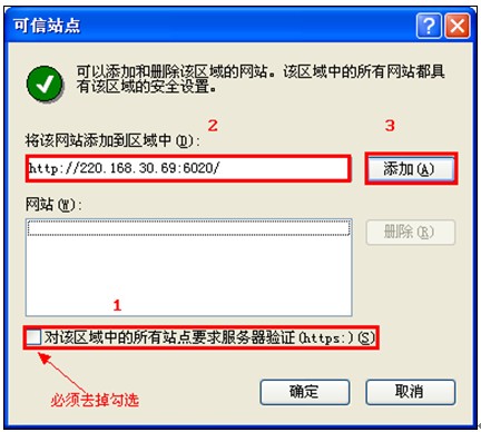在添加可信站點頁面,將http://220.168.30.69:6020 網址添加進去。注:必須將對該區域中的所有站點要求服務器驗證(https://)的勾去掉