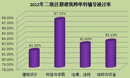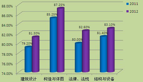 網校2011年二級建筑師四科目與2012年的網校二級建筑師四科目輔導通過率進行比較。其中《場地與建筑設計》較2011年的79.20%提高2.4%;《建筑構造與詳圖》較2010年的85.25%提高2%;《建筑結構與設備》較2011年的80.0%提高2.6%;《法律、法規、經濟與施工》較2011年的81.40%提高1.7%。