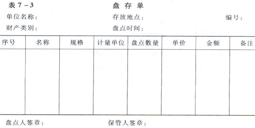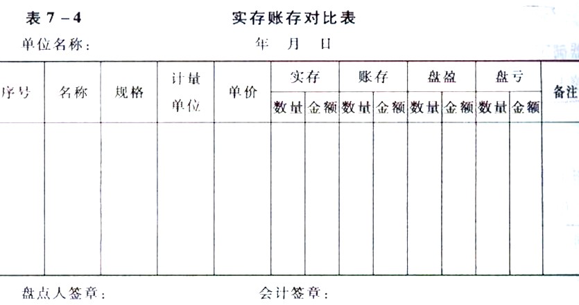 對各項財產物資的盤點結果,應逐一填制“盤存單”,并同賬面余額記錄核對,確認盤盈盤虧數,填制“實存賬存對比表”,作為調整賬面記錄的原始憑證。盤存單及實存賬存對比表的格式如表7―3與表7―4所示。