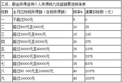 個稅起征點是3500繳稅=全月應納稅所得額*稅率-速算扣除數實發工資=應發工資-四金-繳稅全月應納稅所得額=(應發工資-四金)-3500扣除標準:個稅按3500元/月起征標準算如果某人的工資收入為6000元,他應納個人所得稅為:(6000―3500)×10%―105=145(元)。