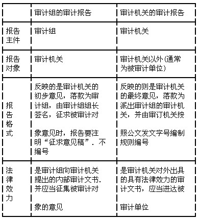 我國國家審計的審計報告是審計機關實施審計后,對被審計單位的財政收支、財務收支的真實、合法、效益發(fā)表審計意見的書面文件。包括審計組的審計報告和審計機關的審計報告兩種。二者的區(qū)別如下