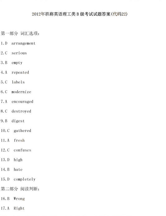 2012年職稱英語理工類B級考試標準答案(代碼22)