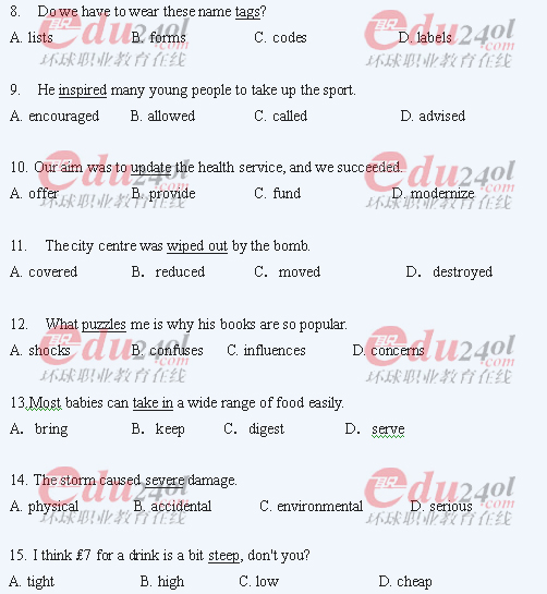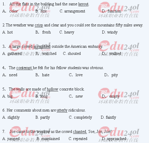 環球網校率先發布2012年職稱英語考試試題及答案-綜合類A級詞匯部分(試卷代碼21),
