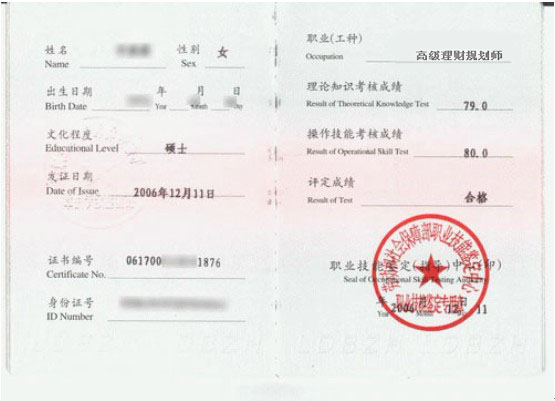國家勞動和社會保障部頒發的國家理財規劃師二級證書為棕色外皮,燙金色字體,印有中華人民共和國職業資格證書字樣及國徽標識。