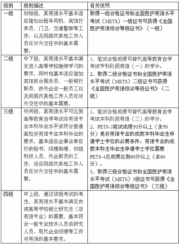 5、教育部考試中心與國家護理人才國際化開發與管理委員會共同推出了《全國醫護英語綜合等級證書》。通過全國英語等級考試(PETS)和全國醫護英語水平考試(METS)一定級別的考生,可以獲得相應級別的《全國醫護英語綜合等級證書》。該證書由教育部考試中心統一頒發,其簽章為教育部考試中心和中華護理學會。