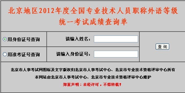 環球網校(9duwan.com)消息,從北京人事考試中心獲悉,2012年北京地區職稱英語考試成績于6月6日開始查詢,成績查詢地址如下: