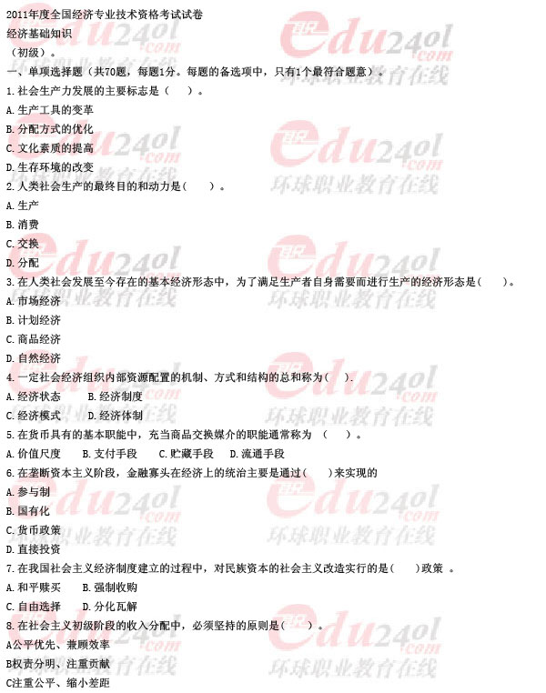 2011年經(jīng)濟(jì)師考試《初級(jí)經(jīng)濟(jì)基礎(chǔ)》真題及答案(1)