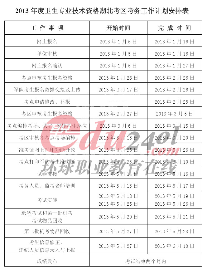 根據湖北省衛生人才交流服務中心文件《關于2013年度衛生專業技術資格考試湖北考區考務工作計劃的通知》(鄂衛人才發【2013】1號)的相關通知,2013年度衛生專業技術資格考試湖北考區考務工作計劃表如下: