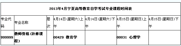 2013年4月寧夏自學(含教師資格補修課程考試)考試計劃