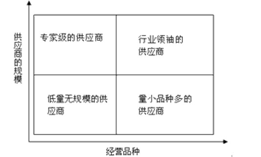 根據(jù)供應(yīng)商的生產(chǎn)經(jīng)營(yíng)規(guī)模和經(jīng)營(yíng)品種不同,可將供應(yīng)商劃分為:老師級(jí)、行業(yè)領(lǐng)袖、低量無(wú)規(guī)模和量小品種多的供應(yīng)商。如下矩陣圖。