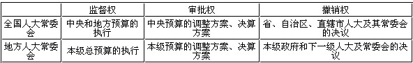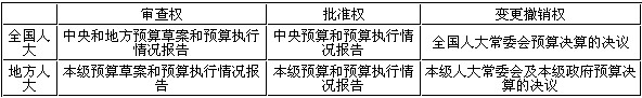 【注意】①對于審查權:全國人大既可以審查中央預算草案也可以審查地方預算草案;地方人大審查本級預算草案