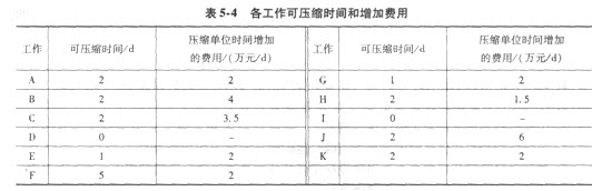 3.若該網(wǎng)絡(luò)進(jìn)度計(jì)劃各工作的可壓縮時(shí)問及壓縮單位時(shí)間增加的費(fèi)用,見表5-4。確定該網(wǎng)絡(luò)進(jìn)度計(jì)劃的最低綜合費(fèi)用和相應(yīng)的關(guān)鍵路線,并計(jì)算調(diào)整優(yōu)化后的總工期(要求寫出調(diào)整優(yōu)化過程)