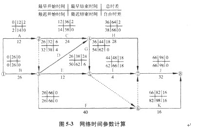 1.網(wǎng)絡(luò)進(jìn)度計(jì)劃原始方案各工作的時(shí)間參數(shù),如圖5-3所示。
