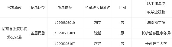 2013年湖南省機場公安局公務員擬錄用名單公示