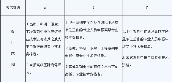 根據《關于調整完善我省職稱外語政策的通知》(粵人發〔2007〕120號),考試等級劃分及適用范圍如下: