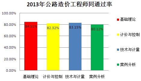 公路工程造價基礎理論及相關法規:84.51%;公路工程造價的計價與控制:82.32%;公路工程技術與計量:83.15%;公路工程造價案例分析:80.12%