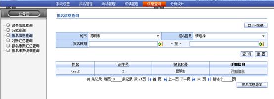 描述:根據地市、區縣、報名日期等組合條件,查詢出已經報名成功的考生列表,
