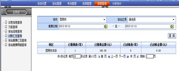 描述:根據各地市、報名區縣、繳費日期等組合條件,查詢出對應的繳費筆數、繳費金額、對賬筆數、對賬金額。