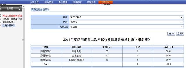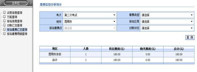 描述:根據考次、繳費類型{網上報名繳費、現場報名繳費}(不選擇則指所有類型)、地市、報名區縣、