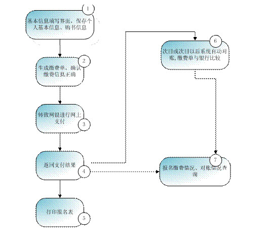 3、對于考生而言繳費成功并完成第⑤步(打印報表名)即完成報名,而此時考生的繳費并未進入非稅專戶(只是銀行代扣成功),所以還需要與銀行進行對賬,只有完成對賬(已對賬)的繳費才算真正的完成繳費,可以通過查詢功能查詢跟蹤繳費、對賬情況;