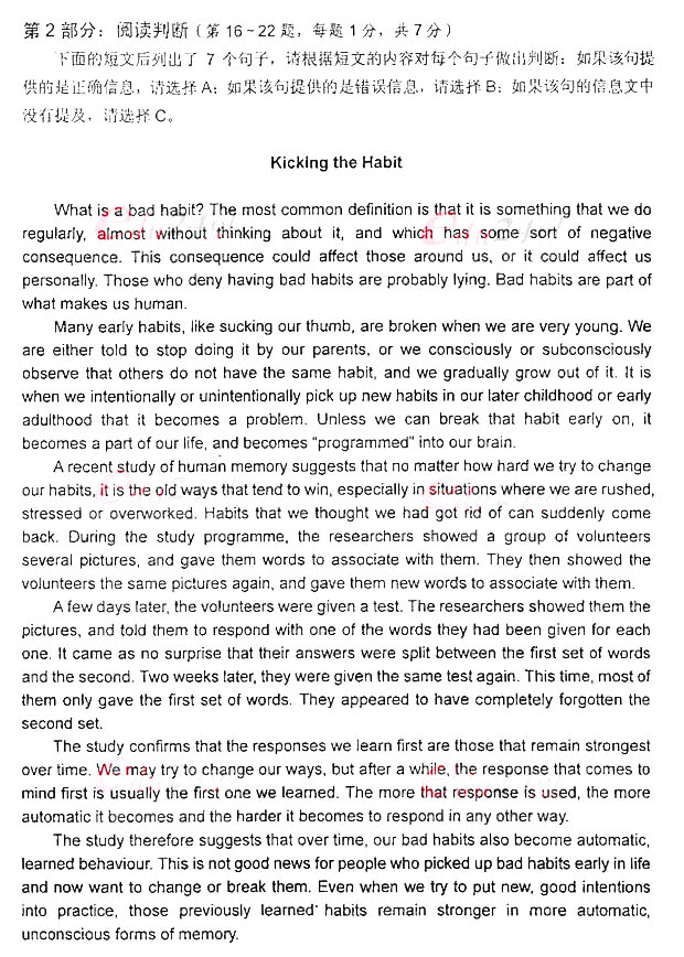 - 職稱英語真題《衛生類b級》閱讀判斷練習2017-06-29