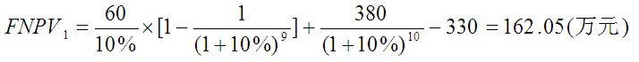 因為FNPV0(10%)=192.05(萬元)>0,所以該投資方案是可行的。