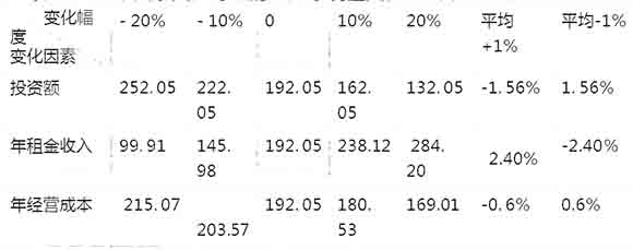 (2)選取不確定因素并設定其變動幅度。根據該投資方案的特點,選取投資額、年租金收入和年經營成本三個不確定因素,并令它們在初始值的基礎上按±10%和±20%的幅度變化。