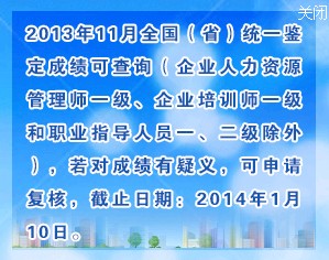 2013年全國(省)統一鑒定成績可查詢(人力資源管理師一級、企業培訓師一級和職業指導人員一、二級除外),若對成績有疑義,可申請復核,截止日期:2014年1月10日。
