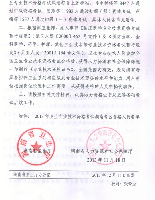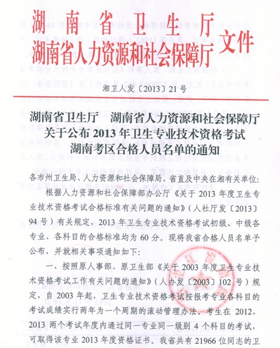 湖南衛生人才網:關于2013年衛生資格考試合格人員名單的通知