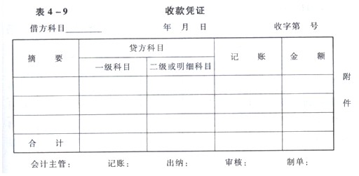 收款憑證適用于現(xiàn)金及銀行存款收入業(yè)務(wù)的記賬憑證。一般格式如教材表4-9所示。