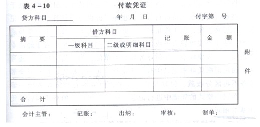 付款憑證是用于現(xiàn)金及銀行存款付出業(yè)務(wù)的記賬憑證。一般格式如教材表4-10所示。